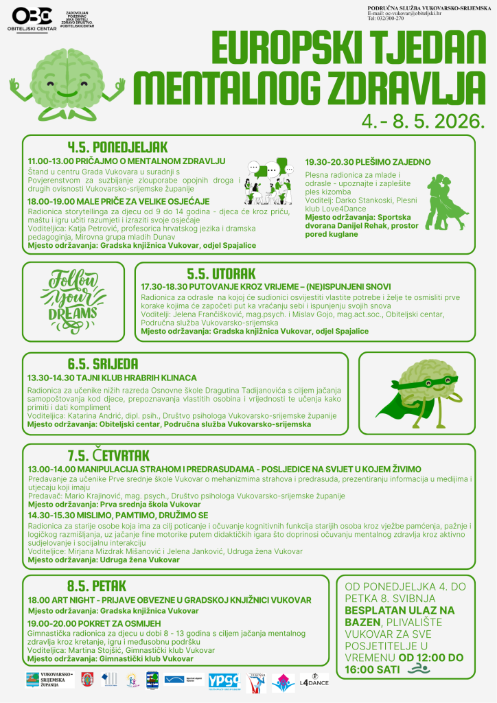 Pozivamo vas da nam se pridružite na obilježavanju Europskog tjedna mentalnog zdravlja kroz niz zanimljivih i korisnih aktivnosti za djecu, mlade, odrasle i starije osobe. 💬✨